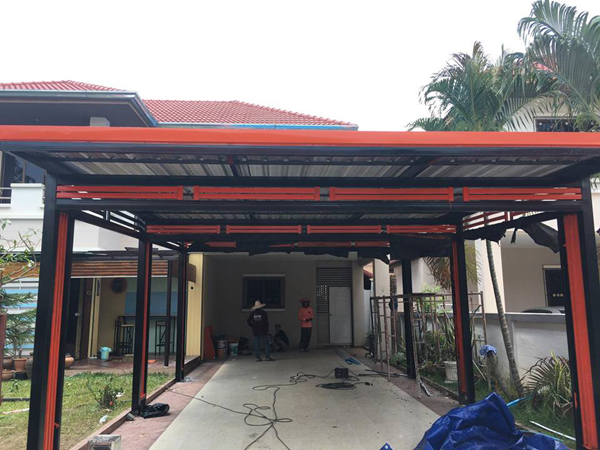 Affordable roofing construction and extension services. We specialize in all types of roofing, offering design and construction for carport roofs, single-house roofs, shopping mall parking lot roofs, walkway roofs leading to shopping malls, carport roof extensions, and house roofs."